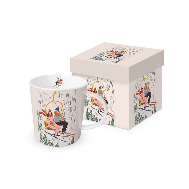 Porcelanowy kubek marki Paper Products Design o pojemności 400 ml to idealny dodatek do codziennych chwil, który możesz podarować sobie lub bliskiej osobie. Kubek ozdobiony jest uroczym motywem pary narciarzy na wyciągu narciarskim na tle ośnieżonego stoku górskiego i zapakowany w eleganckie upominkowe pudełko o tym samym wzorze. Wykonany z najwyższej jakości porcelany kostnej, kubek wyróżnia się elegancją i trwałością. To wyjątkowy element zastawy, który wzbogaci domową kolekcję i sprawi radość każdemu miłośnikowi narciarstwa.
