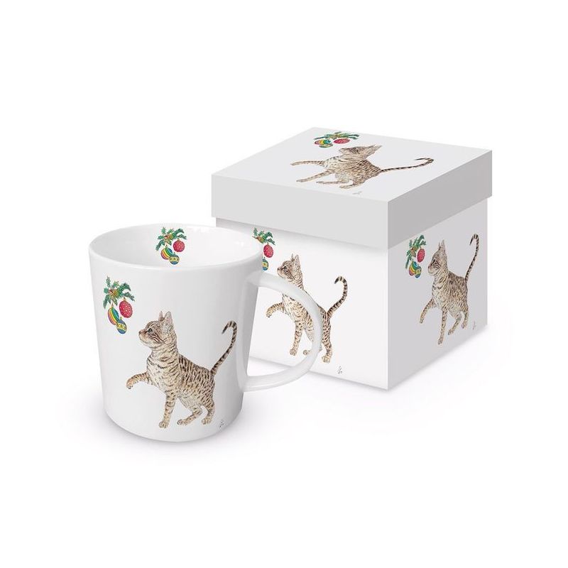 Kubek porcelanowych o pojemności 350 ml, zdobiony uroczym motywem kotka bawiącego się bombką. Wykonany z porcelany charakteryzującej się wyjątkową elegancją i wytrzymałością. Poręczne ucho kubka gwarantuje stabilny uchwyt podczas picia. Zapakowany w ozdobne pudełko, o tym samym motywie. To doskonały pomysł na upominek dla najbliższych, przyjaciół i znajomych.
