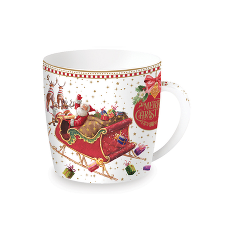 Kubek porcelanowy o pojemności 350 ml o bardzo ładnym, świątecznym motywie Świętego Mikołaja w saniach zaprzężonych w renifery. Wykonany z najszlachetniejszej odmiany porcelany kostnej. Idealnie sprawdza się do serwowania kawy, herbaty, gorącej czekolady, jak i ziołowych naparów. Poręczne ucho gwarantuje stabilny uchwyt podczas picia. Zapakowany w ozdobną puszką, o tym samym motywie. To doskonały pomysł na świąteczny upominek dla najbliższych, przyjaciół i znajomych.