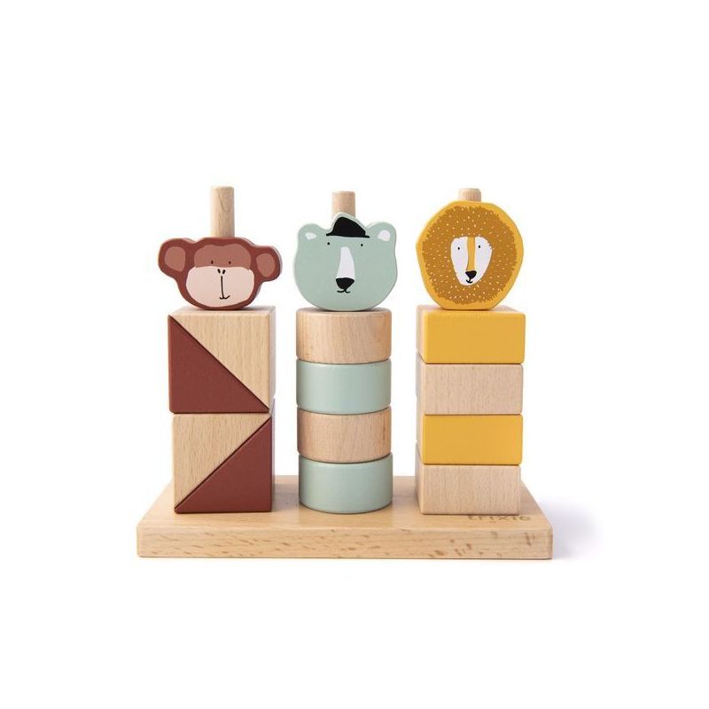 Zabawa polega na tworzeniu zabawnych kombinacji z pięknych, geometrycznych klocków. Dziecko rozkłada klocki, po czym umieszcza je na drewnianych słupkach tak żeby, powstały urocze zwierzaki. Zabawka wpływa na poprawę zdolności manualnych dziecka, doskonali zmysły dotyku i wzroku, uczy rozpoznawania kolorów i wielkości przedmiotów, rozwija dziecięcą wyobraźnię. Produkt wykonany jest w 100% z drewna z certyfikatem FSC©. Farby na tym produkcie są na bazie wody, bezpieczne dla dzieci i nietoksyczne.