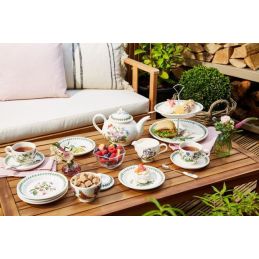 Dodaj uroku porankom dzięki filiżance śniadaniowej z kolekcji Botanic Garden. Ozdobiona pięknym motywem kwiatowym, przyciąga wzrok delikatnymi kolorami i klasycznym wzornictwem. Talerzyk wykończony charakterystycznym, liściastym rantem doskonale komponuje się z filiżanką, tworząc elegancki zestaw na codzienne chwile z kawą lub herbatą. Wykonany z wysokiej jakości kamionki, zestaw nadaje się do użycia w kuchence mikrofalowej i zmywarce.