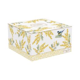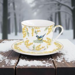 Filiżanka śniadaniowa ze spodkiem z kolekcji Mimosa ze wzorem uroczej sikorki. Motyw żółtych mimoz symbolizuje świeżość i radość, a delikatna porcelana podkreśla elegancki charakter serii. Idealna do codziennego użytku oraz jako prezent.
