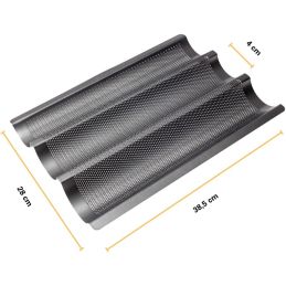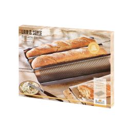 Model o wymiarach 38,5 x 28 cm umożliwia jednoczesne pieczenie trzech bagietek, co pozwala zaoszczędzić czas i energię. Wysokiej jakości metal gwarantuje trwałość i równomierne pieczenie, a nieprzywieralna powłoka ułatwia wyjmowanie gotowych wypieków oraz utrzymanie formy w czystości. Zalecane jest mycie ręczne, aby zachować jej właściwości na dłużej.