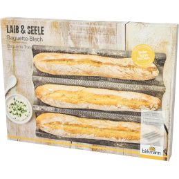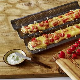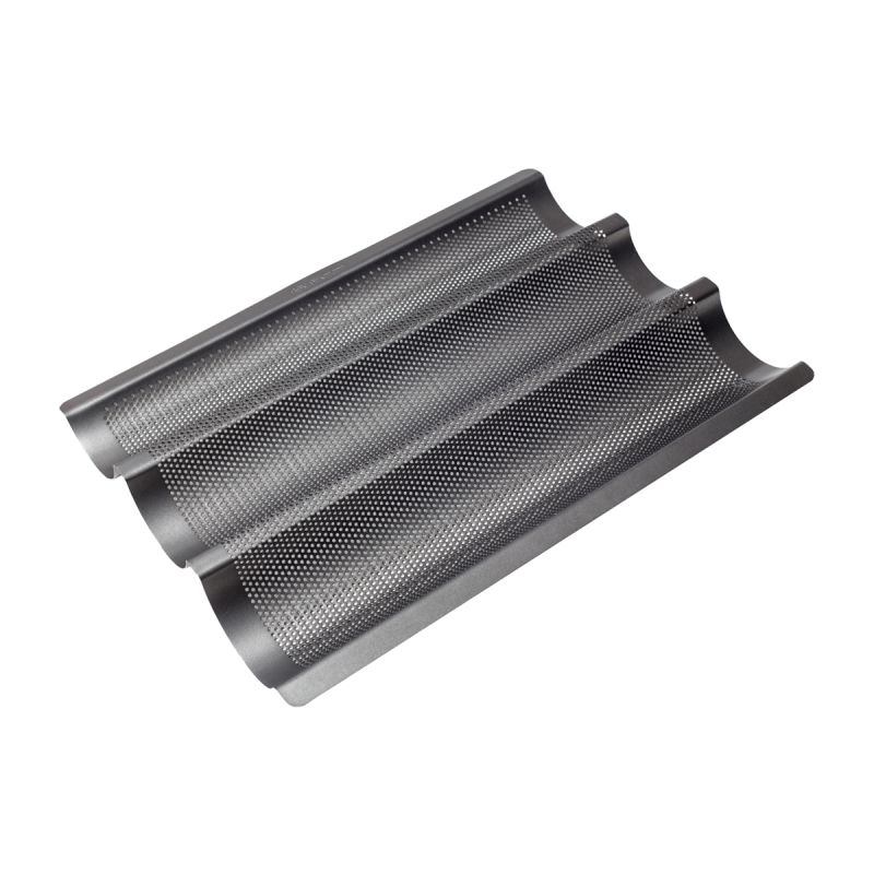 Forma została wykonana z perforowanej blachy w Niemczech, która zapewnia równomierne rozprowadzanie ciepła i optymalną cyrkulację powietrza. To właśnie dzięki perforacjom wypieki zyskują charakterystyczną, chrupiącą skórkę oraz idealnie dopieczone wnętrze. Każde z trzech wgłębień przeznaczone jest na porcję ciasta o wadze od 250 do 350 g, co pozwala uzyskać klasyczne bagietki o odpowiednim kształcie i wielkości.