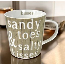 Kubek porcelanowy o pojemności 350 ml, zdobiony motywem drewnianych desek z pokładu statku i gwiazd oraz stylizowanym napisem: „Sandy toes & salty kisses”. Wykonany z porcelany charakteryzującej się wyjątkową elegancją i wytrzymałością. Poręczne ucho gwarantuje stabilny uchwyt podczas picia. Zapakowany w ozdobne pudełko, o tym samym motywie. To doskonały pomysł na upominek dla najbliższych, przyjaciół i znajomych.