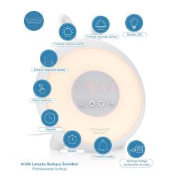 Jest to również podręczna lampka nocna, która świeci światłem w różnych kolorach. Jasność można regulować w zależności od potrzeb i otoczenia. Lampka posiada funkcję drzemki, dla tych bardziej opornych - wystarczy wcisnąć przycisk powtarzania budzenia i skorzystać z dodatkowego czasu na sen. Budzi dźwiękiem 5 melodii, w tym dwóch odgłosów natury. Wyposażona jest w antypoślizgowe nóżki, sterowanie dotykowe, cyfrowy wyświetlacz z ustawieniami 12h/24h.