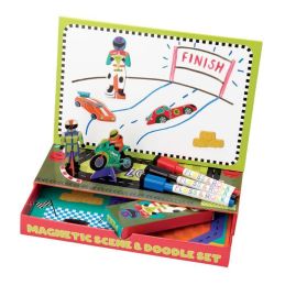 Zestaw zawiera magnetyczne elementy do tworzenia scen oraz wbudowaną tablicę do rysowania z dołączonymi mazakami suchościeralnym. Zamykane pudełko sprawia, że wszystkie elementy są bezpiecznie przechowywane, a produkt doskonale sprawdza się również w podróży. Zabawa polega na komponowaniu własnych historii oraz wielokrotnym rysowaniu i ścieraniu ilustracji.