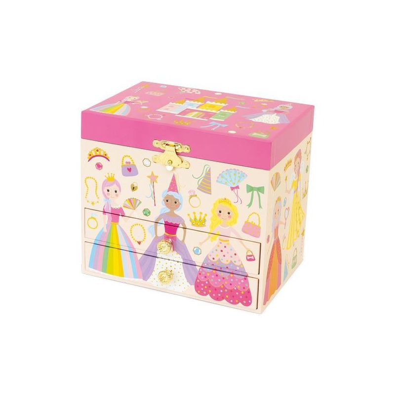 Szkatułka została wykonana z materiałów pochodzących z recyklingu, ozdobiona błyszczącymi folią i nadrukami przedstawiającymi motywy księżniczek. Mechanizm nakręcany z tyłu aktywuje „Carousel Waltz” oraz wirującą figurkę. Dwa schowki szufladkowe zapewniają łatwe przechowywanie biżuterii czy drobnych pamiątek, a kolorowe pudełko prezentowe dodaje uroku i gotowości na wręczenie podarku.\