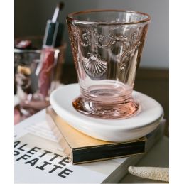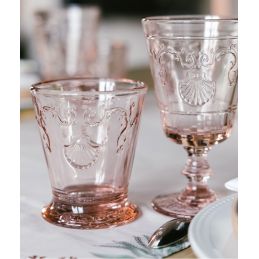 Szklanka z bogato zdobionej kolekcji Versailles francuskiej marki La Rochère, wykonana z prasowanego szkła, ozdobiona reliefowymi motywami barokowymi kwiatów, pnącej się roślinności i przegrzebków. Idealnie nadaje się do serwowania zimnych i ciepłych napojów.