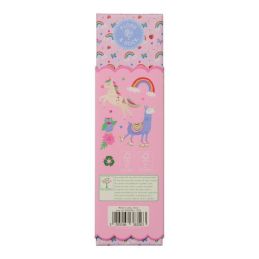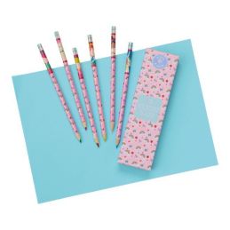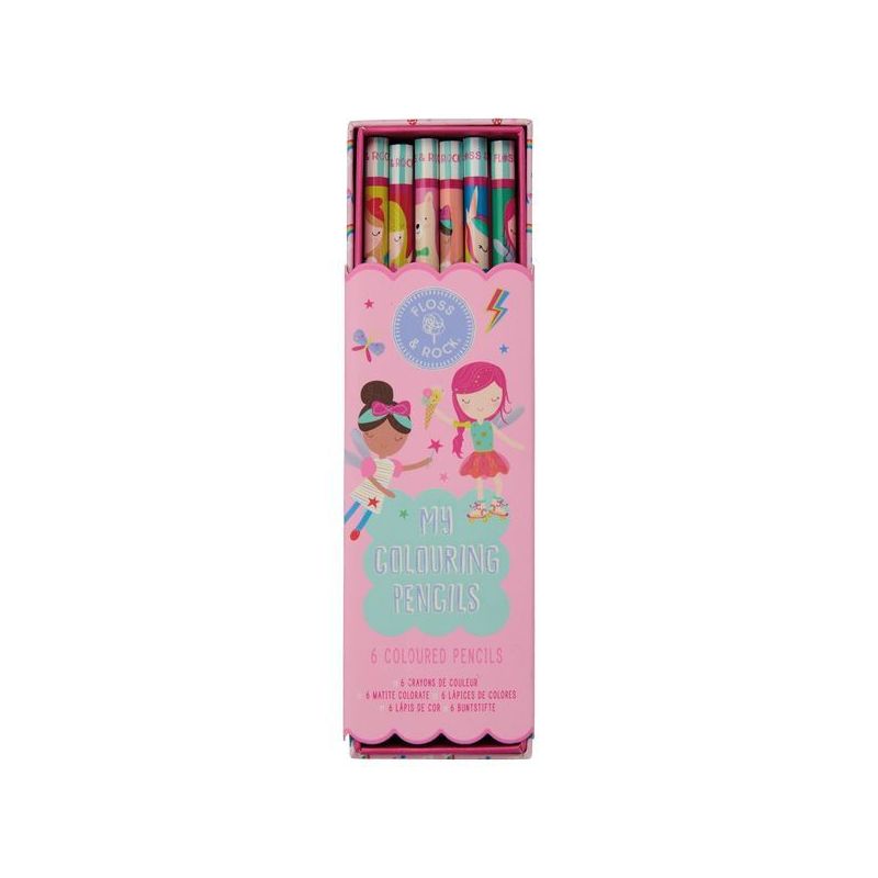 Komplet 6 kolorowych kredek ołówkowych zapakowanych w dekoracyjne kartonowe pudełko z grafiką wróżek.