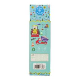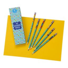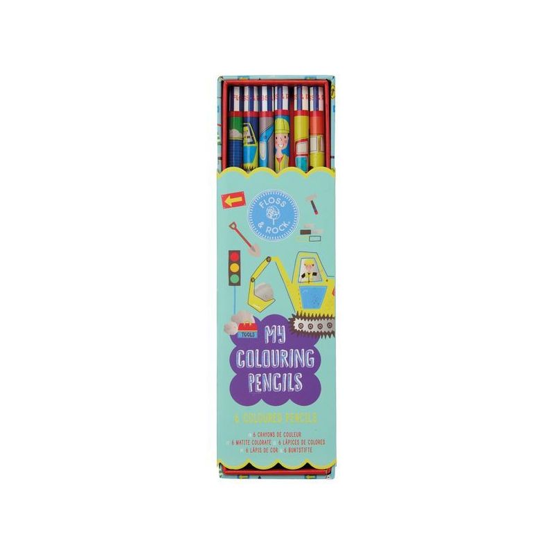 Komplet 6 kolorowych kredek ołówkowych zapakowanych w dekoracyjne kartonowe pudełko z grafiką placu budowy.