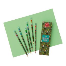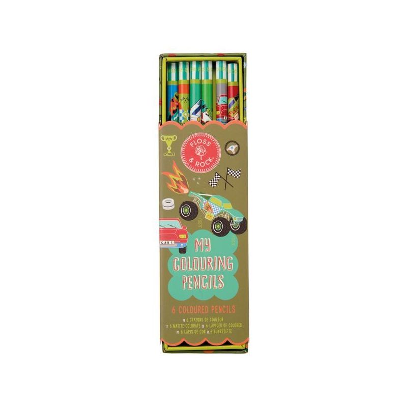 Komplet 6 kolorowych kredek ołówkowych zapakowanych w dekoracyjne kartonowe pudełko z grafiką samochodów.